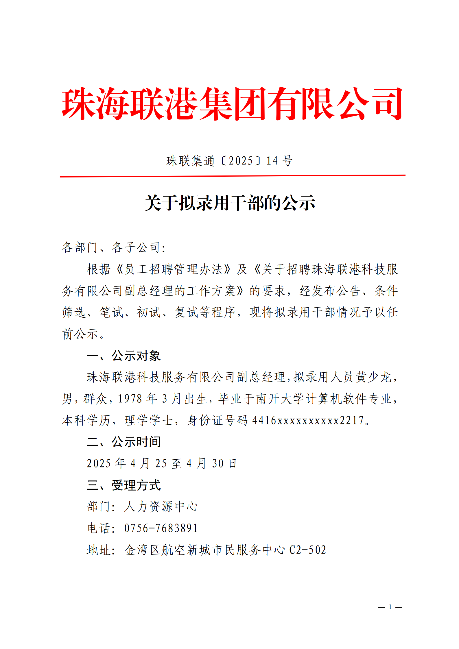 珠聯(lián)集通〔2025〕14號 關(guān)于擬錄用干部的公示
