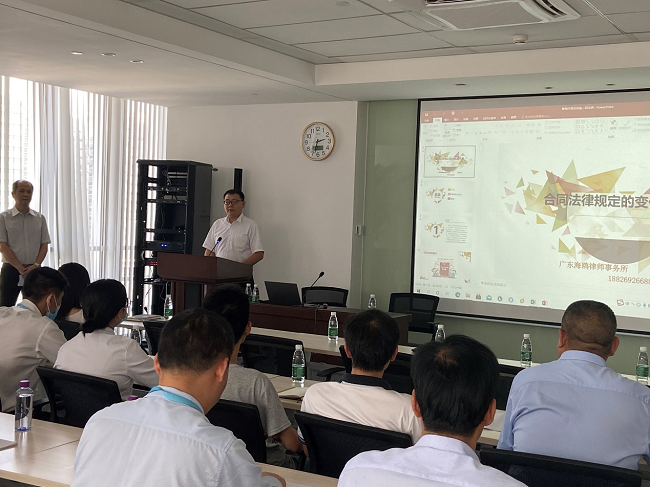 劉付寧律師在講座中,圍繞解除權(quán)行使期限、預(yù)約合同、承諾函的法律效力、違約人解除合同等12項(xiàng)內(nèi)容認(rèn)真解讀了《民法典》合同篇的重要修改條款,深入淺出地分析了5個(gè)合同糾紛經(jīng)典案例,對(duì)違法依據(jù)、適用法律條款、處罰結(jié)果等進(jìn)行認(rèn)真講解,同時(shí)結(jié)合我司日常生產(chǎn)經(jīng)營(yíng)和物業(yè)管理實(shí)際情況,詳細(xì)闡述了合同簽訂相關(guān)注意事項(xiàng)、合同法律風(fēng)險(xiǎn)防范技巧等法規(guī)知識(shí)。劉律師的講座內(nèi)容豐富,語(yǔ)言幽默,專業(yè)針對(duì)性強(qiáng),現(xiàn)場(chǎng)反響十分熱烈。