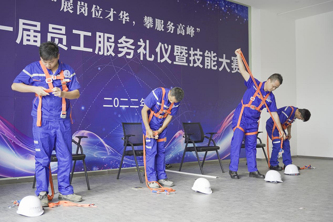 安全繩及安全帽規(guī)范穿脫是工程人員在高空作業(yè)前必備的一項(xiàng)技能,7名選手的精彩展示,贏得了現(xiàn)場(chǎng)觀眾和評(píng)委的陣陣掌聲。