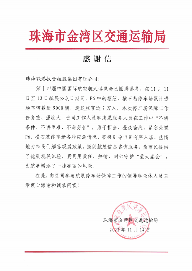 珠海市金灣區(qū)交通運輸局向聯(lián)港集團參與航展停車場保障工作的領導和全體人員表示衷心感謝和誠摯問候!