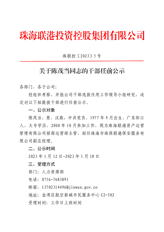 珠聯(lián)控〔2023〕5號 關(guān)于陳茂當(dāng)同志的干部任前公示
